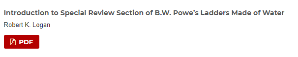 When you are reading LADDERS MADE OF WATER, you are immersing yourself in one of the great poetic minds of our century.   I love Powe’s writing and hope you’ll buy this book.  Both of us were students of Marshall McLuhan, and B.W’s writing about the Man of LaManitoba (McLuhan) is among the most knowledgeable, sensitive, and helpful.  Powe wrote the definitive book about the McLuhan-Frye relationship and is an important, top commentator about the poets, artists, and communication of our day.  A professor at York, BW is also a masterful teacher, so using his books in the classroom is a real plus for students.  LADDERS MADE OF WATER has my highest recommendation.